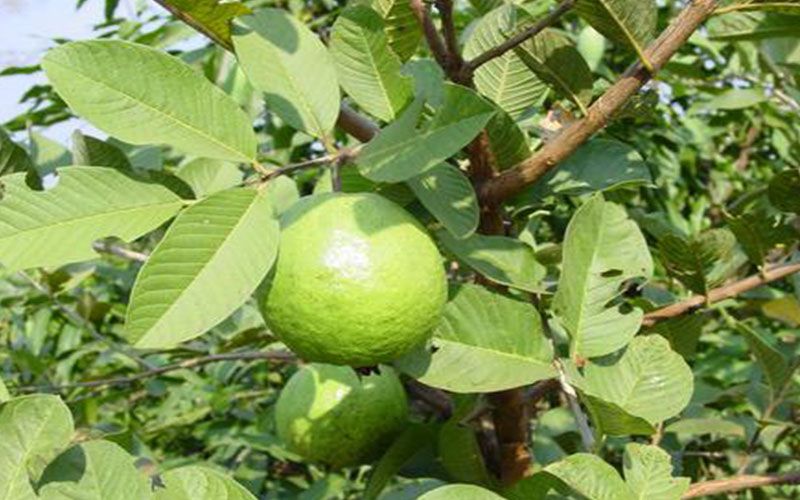 The guava fruit grows on a small tree with a wide, short canopy and a sturdy single to multi-stemmed trunk. The guava tree is an interesting plant with mottled greenish bark and long 3- to 7-inch serrated leaves. Guava trees produce white, 1-inch flowers that yield to small round, oval or pear shaped fruits. These are more accurately berries and have soft flesh, which may be white, pink, yellow or even red and varies in taste from sour to sweet depending on variety.